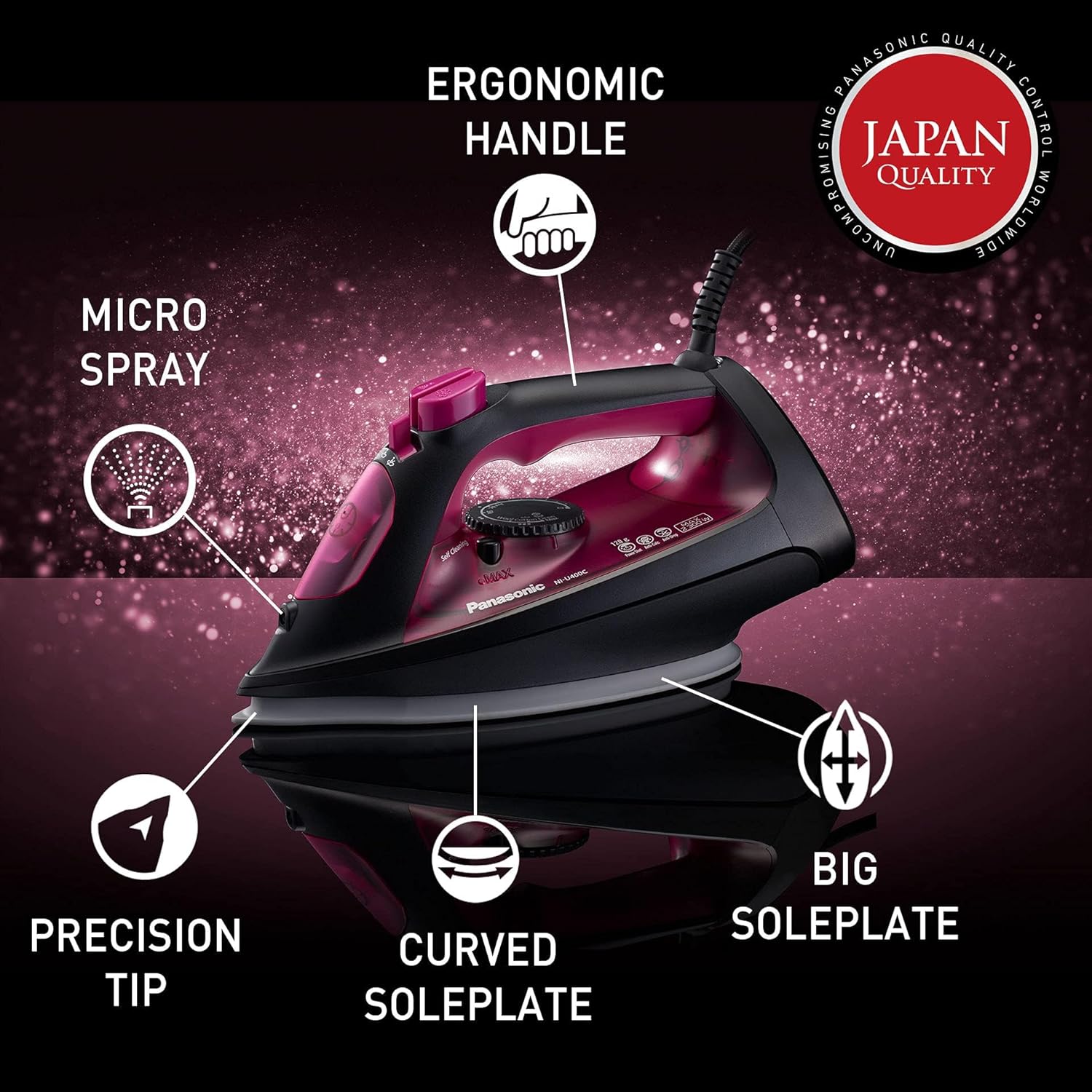 Panasonic Steam Iron, 2300W, Ni-U400, Pink, Big Ceramic Soleplate Achieve quick results with powerful 2300w Big ceramic soleplate allows covering...